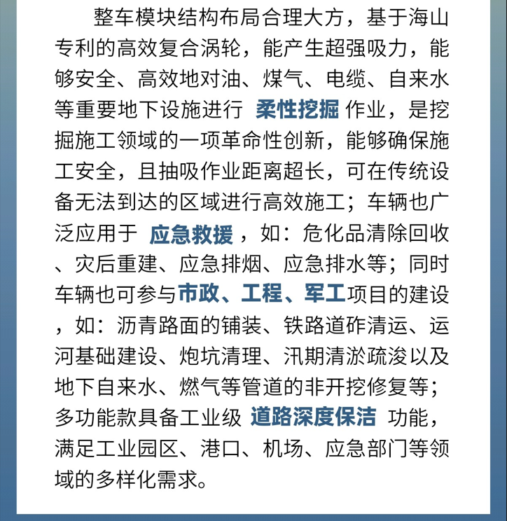 ??2016年福州尼博特洪災(zāi)救援:海山多功能挖掘抽吸車靈活應(yīng)對窄巷、院墻、溝渠等工況,可跨溝越障,高效清理災(zāi)后現(xiàn)場,同時兼顧路面清潔。
