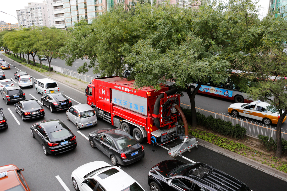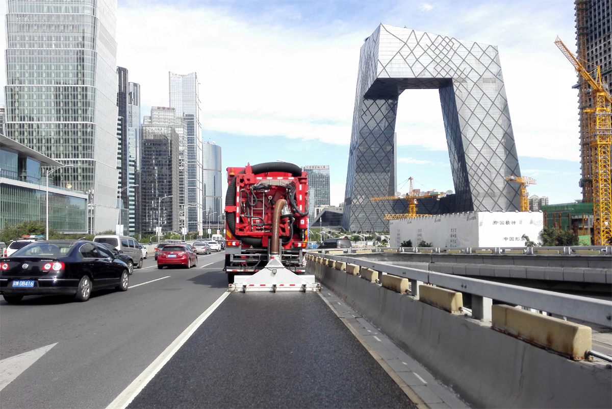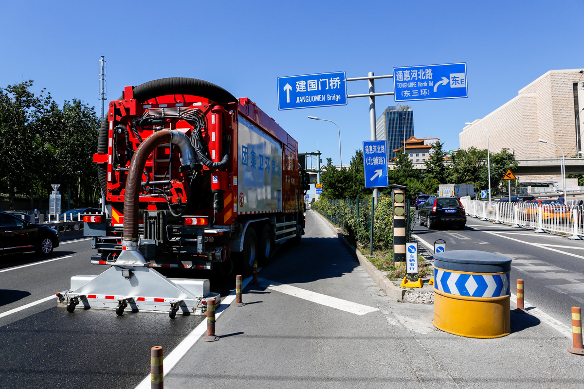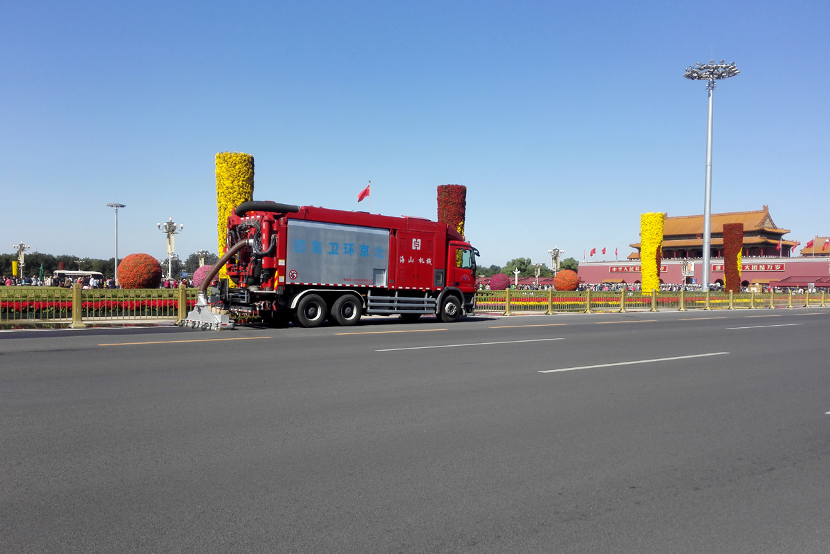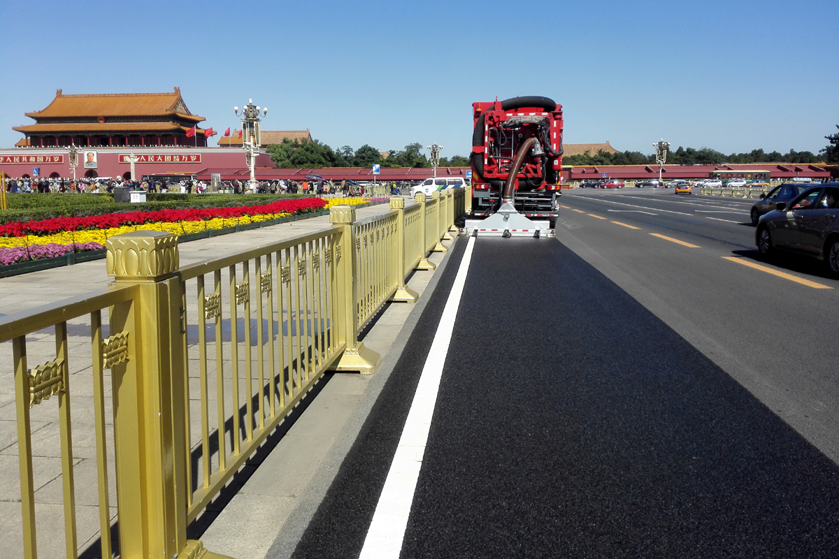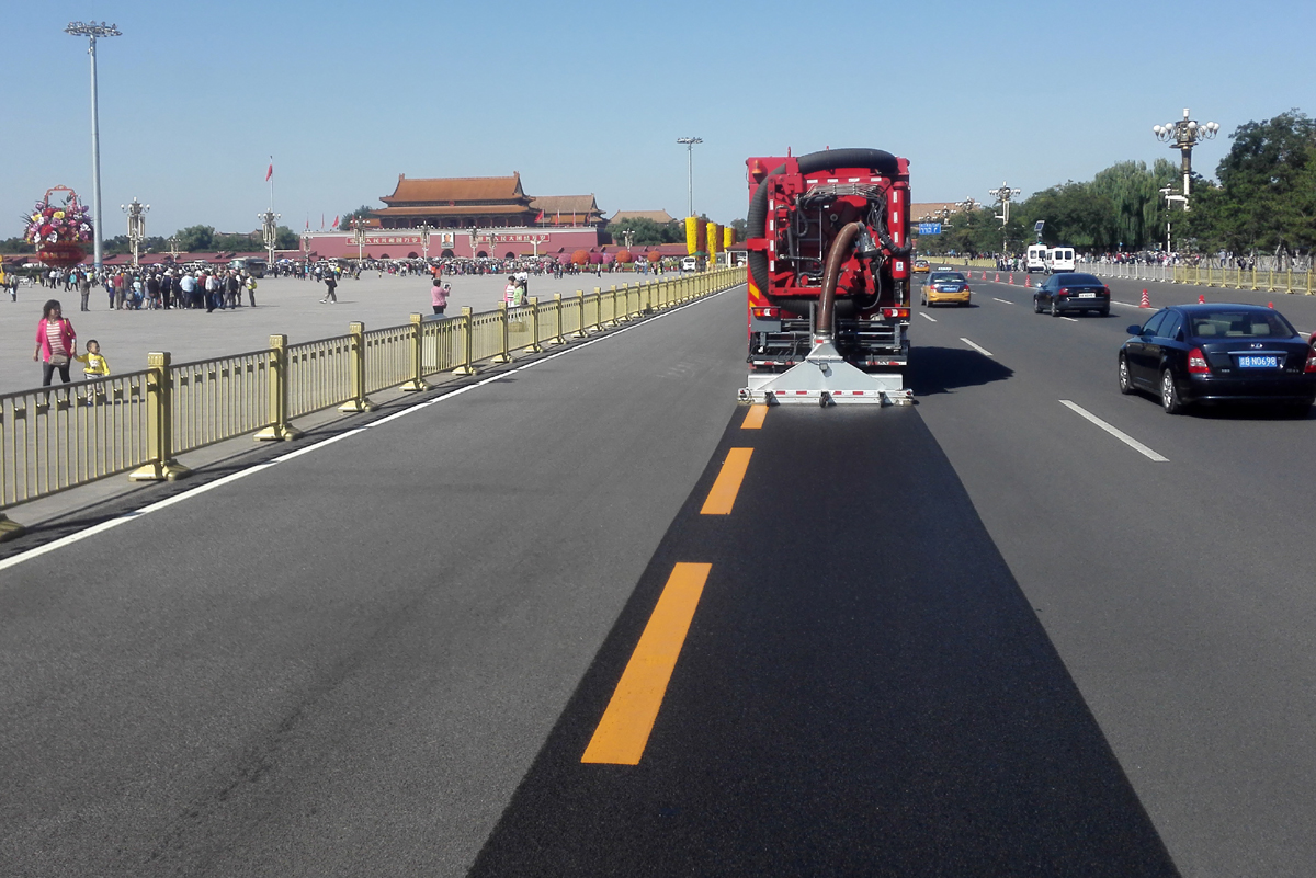 北京市天安門廣場、二環線、三環線、長安街等主干道路面的深度清潔施工,經過清理的路面顯露出了路面鋪設之初的本色,縫隙可見,標線清晰,與只經過普通機掃的路面形成鮮明對比,此次大范圍清潔之后,使得城區主干道更干凈,還北京一片藍天。