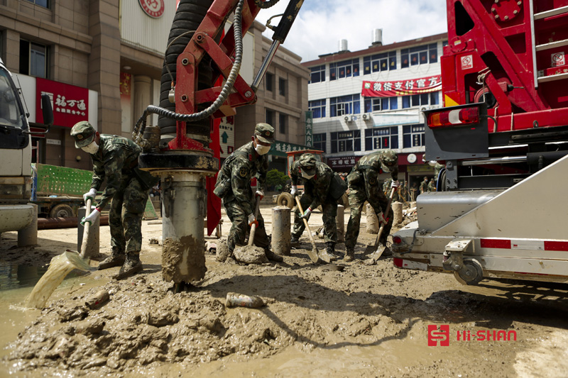 武警8710部隊官兵承擔了最為艱難的農貿市場道路清淤、消殺防疫的攻堅戰。為提高救援施工效率,武警部隊與海山機械迅速動員,火速趕赴100多公里以外的災區。